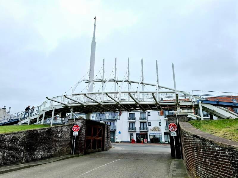Eine der beiden futuristischen Deichbrücken. Die Fußgängerbrücken sind die beliebtesten Fotomotive des Küstenortes.